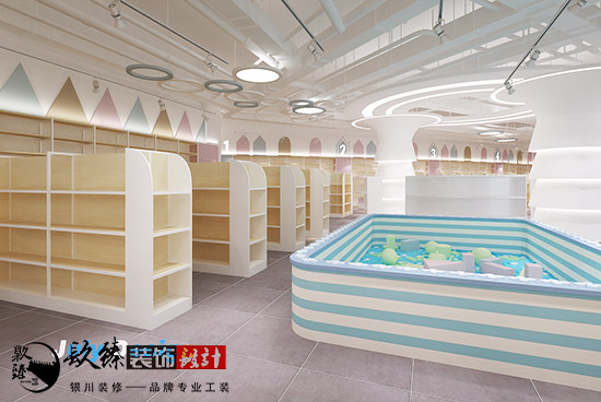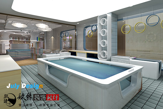 在本套方案中,分為了產品展示區(qū),娛樂區(qū),收銀區(qū),還有一個大的區(qū)域,就是銀川母嬰店裝修設計|銀川裝修網嬰兒游泳區(qū),這里用玻璃作為隔斷,很清楚的讓外面等候的家長們看到了里面寶寶游泳的場景,滿是溫馨的畫面。