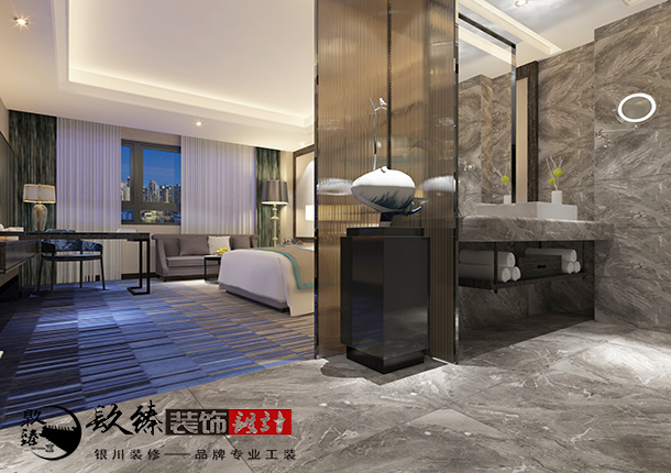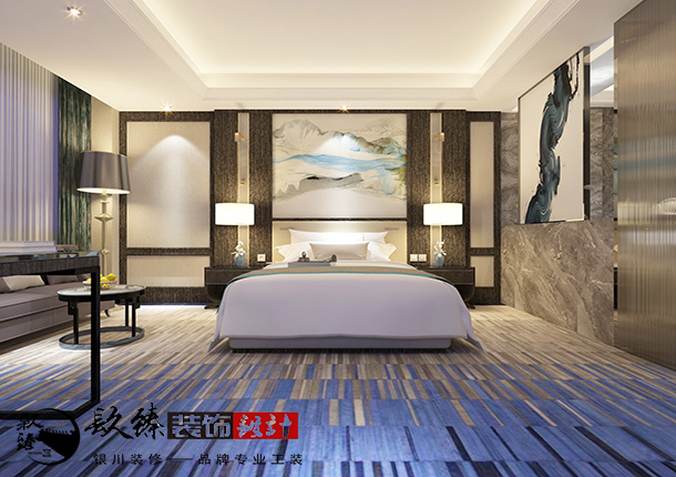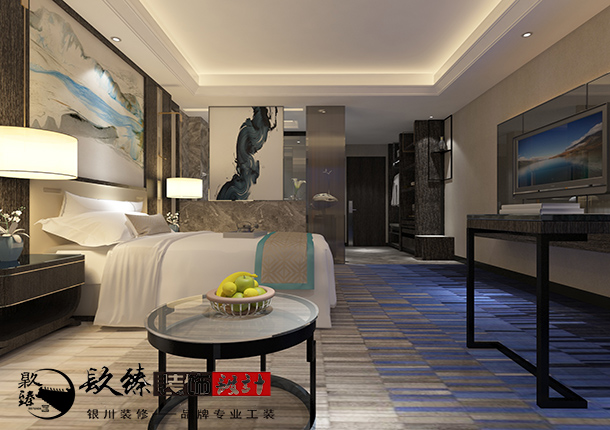 該酒店展現(xiàn)設(shè)計的大床房給人一種當(dāng)代藝術(shù)感,墻面以及床頭的掛飾猶如一幅水墨畫,飄飄而來,輕輕而去。除了具有文藝氣息的裝飾畫以外,最具有現(xiàn)代感就屬地面的地毯和進(jìn)門的衣帽柜了,設(shè)計師利用金屬與木頭兩種不同的材質(zhì)搭配展現(xiàn)出現(xiàn)代的時尚感,一間平米不大的大床房間瞬間被銀川裝修公司銀川酒店裝修設(shè)計刻畫的高大尚了起來。