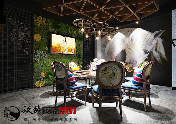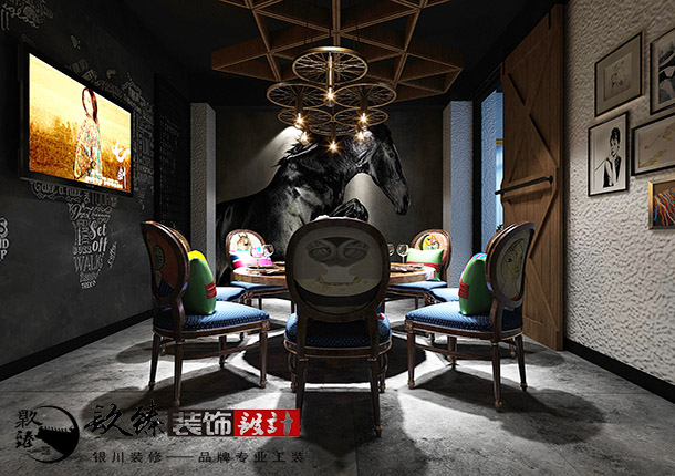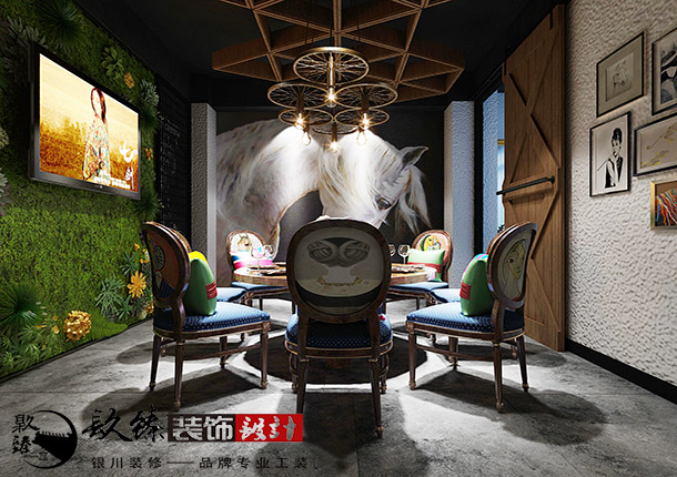 包房的設(shè)計中較為私密的空間,因干凈、不被打擾,表現(xiàn)出一定的安全感。其一,具有鮮明地方文化傳統(tǒng)的特點,使顧客產(chǎn)生新鮮感;其二,與家一樣符合生活習(xí)慣,親切,包間內(nèi)適合的燈光能讓菜品更具誘惑力,增加菜肴亮點并起到增加食欲。一幅生動的壁畫,配以室內(nèi)木質(zhì)墻面裝飾,吊頂部分使用木質(zhì)車輪造型作為裝飾,更與自然相互結(jié)合,電視墻的設(shè)計使用人造花朵和人造草坪搭配,如同草原一樣,突出了該餐廳的主題特色。包間整體內(nèi)使用黑白色系,裝飾上使用亮色系的桌椅進行中和效果,加上燈光的照射下,使空間的的色彩感十分的柔和。所有的元素搭配都貼近人文與自然,聽接近蒙古特色,這也是本案設(shè)計最終要表達的主題,蒙餐文化是游牧民族的智慧和文化沉淀的表現(xiàn),在飲食文化中,蘊藏著他們的歷史傳統(tǒng),也滲透著游牧文化的精髓,同時也體現(xiàn)著蒙古族人民對自然的崇尚和對自由的向往,追求人與自然的融合。