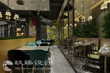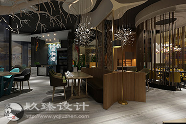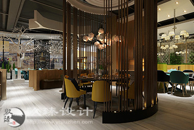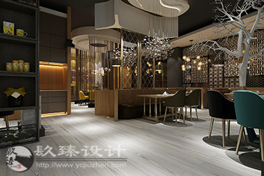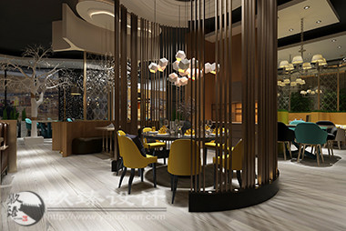 本案整體以中式復(fù)古風(fēng)格為主,銀川裝飾公司銀川裝修公司镹臻設(shè)計(jì)設(shè)計(jì)師主要利用線性平面來劃分室內(nèi)空間的功能與布局。開間方向流動(dòng)相的座椅和餐桌,與流動(dòng)型的鏤空隔斷形成了一個(gè)整體,造型增強(qiáng)了空間的親密氛圍。該風(fēng)格不但能夠搭配著迷幻的色彩,還能促使人沉迷于餐廳之中。尤其在餐廳大堂,做舊古木色的餐桌餐椅,一排排的餐桌整潔亮麗,餐桌上的餐具擺放也是很有講究,整個(gè)內(nèi)飾都充斥著圓滑和時(shí)尚的現(xiàn)代風(fēng)味。餐廳遠(yuǎn)景圖,遠(yuǎn)遠(yuǎn)望去像是一副古典的畫,色彩的搭配和細(xì)節(jié)的設(shè)計(jì)恰到好處。