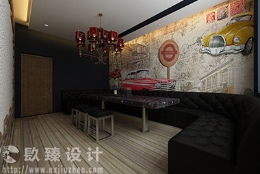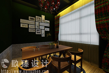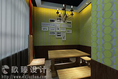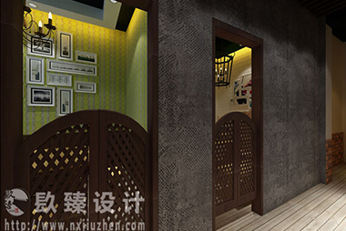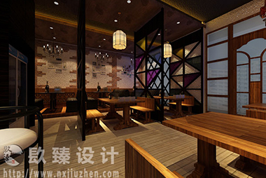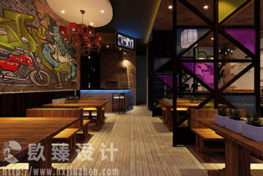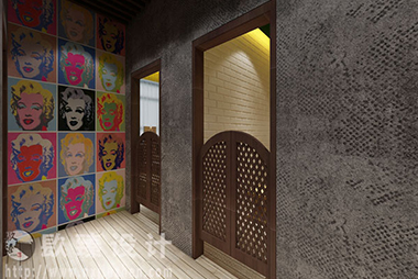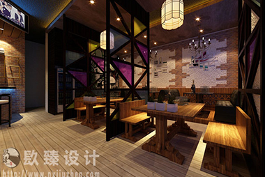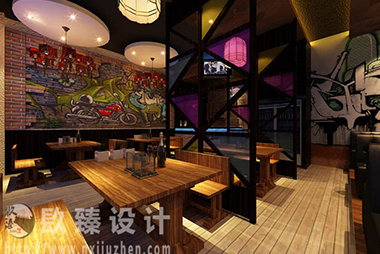 本案例的主要元素包括:木質(zhì)元素、文化磚、藝術(shù)涂鴉、玻璃鏡、真石漆、壁紙等相互配合,給西北燒烤帶來(lái)全新而又充滿新穎的空間環(huán)境,并且呈現(xiàn)出完全不同于其他風(fēng)格的主題感覺(jué)。而且在顧客用餐的位置上使用木質(zhì)屏風(fēng)隔斷,期間的框條夾層運(yùn)用藍(lán)色與紫色玻璃鏡穿插,不但能讓空間具有隱私的感覺(jué),還能在有色玻璃的渲染下,體現(xiàn)空間不一般的穿透能力。