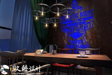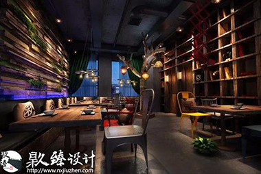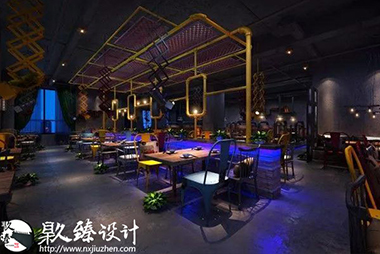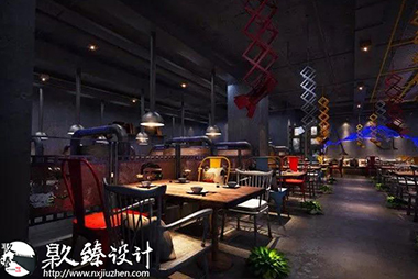 燒烤店其中的一角文化墻上的海苔是這片空間為數(shù)不多的綠植,為工業(yè)風格的燒烤店帶來一抹綠意,小清新躍入眼簾,很好的緩解了視覺疲勞。清水混凝土墻與鋼的巧妙配合,鐵管與暖色燈光的色彩互動,削減了鋼鐵冷視覺,柔和了空間美。原木的置物架上擺放著主人心愛的藏品,或許是幾個空酒瓶,或許是一卷麻布,又或者是一對仿真羚羊角,全憑主人心情與愛好,也許別人并不覺得有多么珍貴,但是在主人眼里他卻是無價之寶。將工業(yè)風格與燒烤店完美的結(jié)合起來,鋼鐵空間中也不乏柔情,設計的韻味就體現(xiàn)在此處。