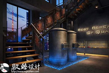 光看圖片暗色系的裝飾給人以不真實的感覺,用清水混凝土、鋼、原木等自然物架構(gòu)打造內(nèi)部空間,局部綠植的點綴,冷暖色調(diào)的反差對比,給人以夢幻的感覺,并營造出復古懷舊的浪漫氣氛,也更好地強調(diào)了設計的主題。粗糙的水泥抹平地面是粗狂的,然而藍紫色燈光又給了這片空間一種妖艷的視覺感受。