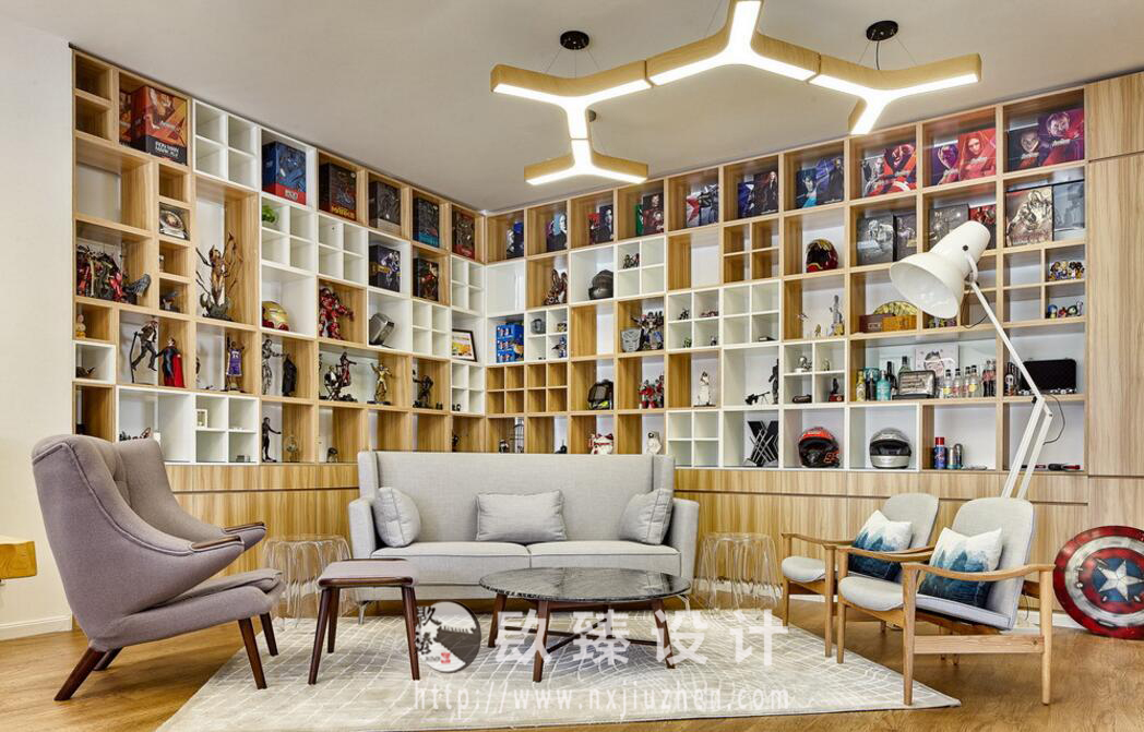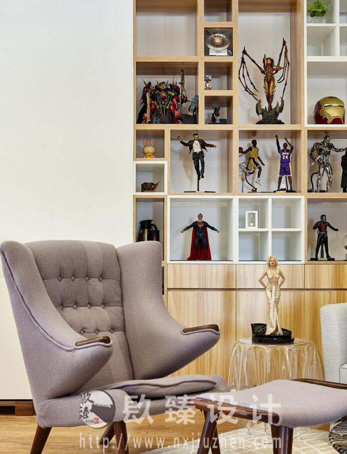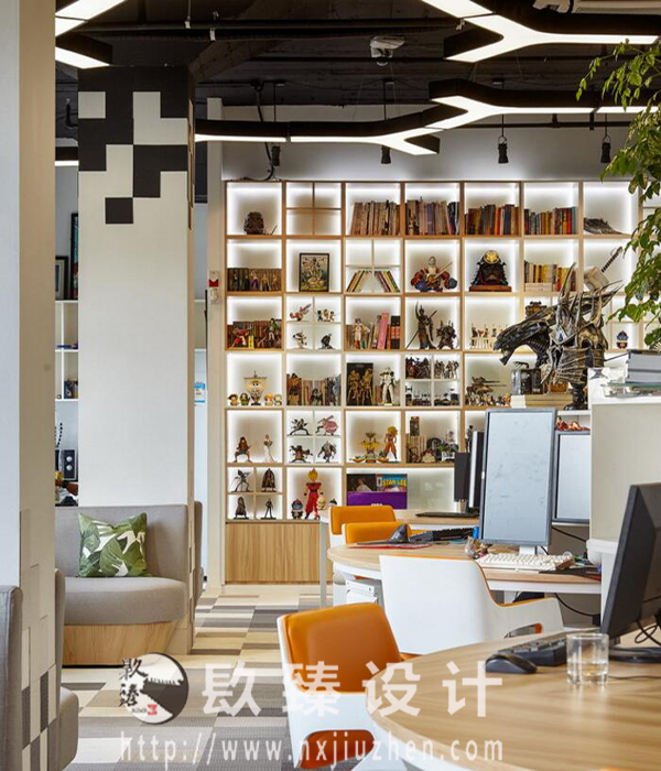 通往主要辦公區(qū)域和接待區(qū)的大面積墻面柜,采用小方格柜逐個拼接組合,馬賽克以具體直觀的形式,成為空間中最醒目的點綴。大量精美的手辦整齊地放置其中,與格柜組合一起,猶如放大的像素方塊將縮略的影像畫面囊括起來,形成循環(huán)往復的動態(tài)錯覺。