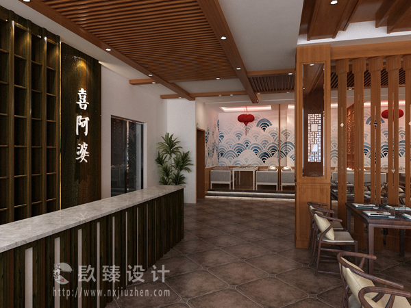 同時(shí),傳統(tǒng)的中式風(fēng)表達(dá)出了中華民族的文化底蘊(yùn),在設(shè)計(jì)時(shí)結(jié)合了現(xiàn)代化的變化和傳統(tǒng)的氣質(zhì)融合,適當(dāng)?shù)牧舭缀侠淼臓I(yíng)造出一種東方人特有的情懷,整體的餐桌以及其它木質(zhì)家具顏色選用比較沉穩(wěn)的棕色木材來(lái)裝飾,墻上的壁畫及門窗設(shè)計(jì)給中式喜阿婆粥餅店增添了不一樣的氣質(zhì)。