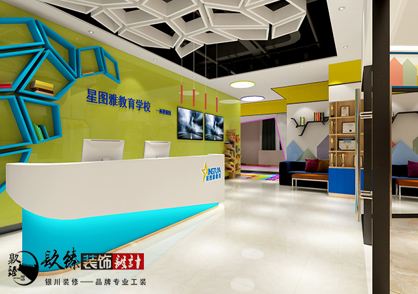 興趣培訓(xùn)班有很多分類,想要再眾多的培訓(xùn)班中得到更多家長的認(rèn)可,那就必須要在前期的裝修上花些功夫。今天銀川裝修公司镹臻裝飾帶來的培訓(xùn)班裝修設(shè)計(jì)的前臺(tái)的擔(dān)任了門面的作用,所以設(shè)計(jì)了醒目的形象墻,用鮮艷而溫柔的亮色,而不是用暗色調(diào)。明亮的黃色使空間的活力感倍增,黑色線條封邊使空間看著更有層次感,形象背景墻以淺綠色更加清新,墻上根據(jù)實(shí)際前臺(tái)的空間情況配合現(xiàn)代化的造型設(shè)計(jì),設(shè)置了學(xué)校的名稱。