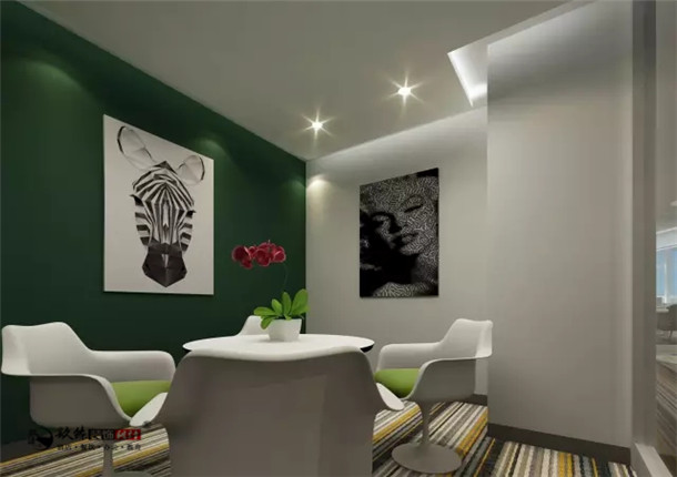 洽談區(qū)的墻面則用乳膠漆、白色乳膠漆相互配合,在塑膠地面的配合下,墻面上的藝術(shù)掛畫、石膏吊燈配合燈帶,這一系列設(shè)計元素,都能在色彩搭配和設(shè)計元素搭配中,展現(xiàn)出洽談區(qū)輕松愉快的氛圍。